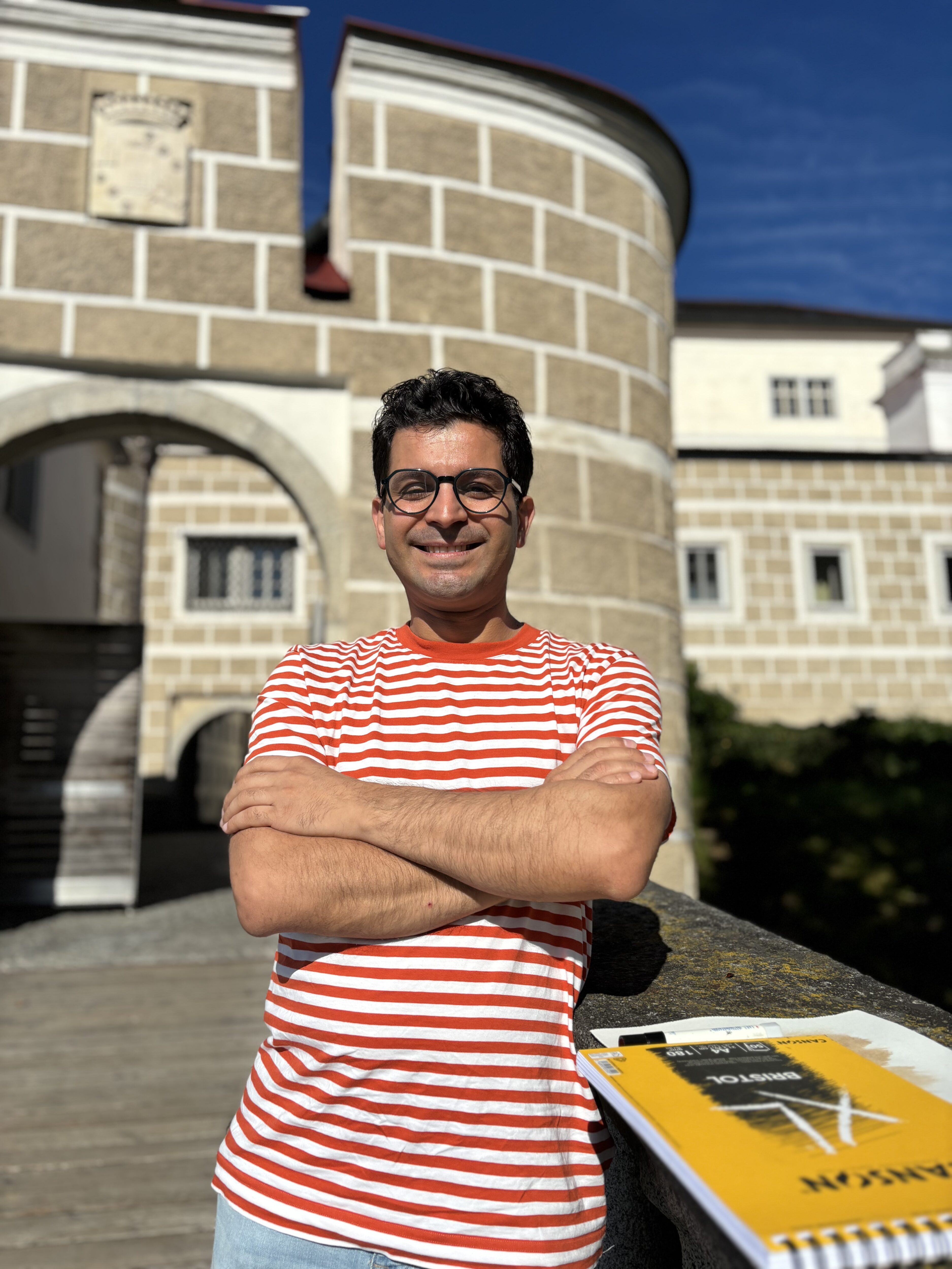 Der Künstler mit syrischen Wurzeln, der seit 2014 in Österreich lebt und an der Kunstuniversität Linz sein Studium der Malerei und Grafik abgeschlossen hat, arbeitete während seines einmonatigen Künstleraufenthalts auf Schloss Weinberg an seinen Zeichnungen und Malereien.